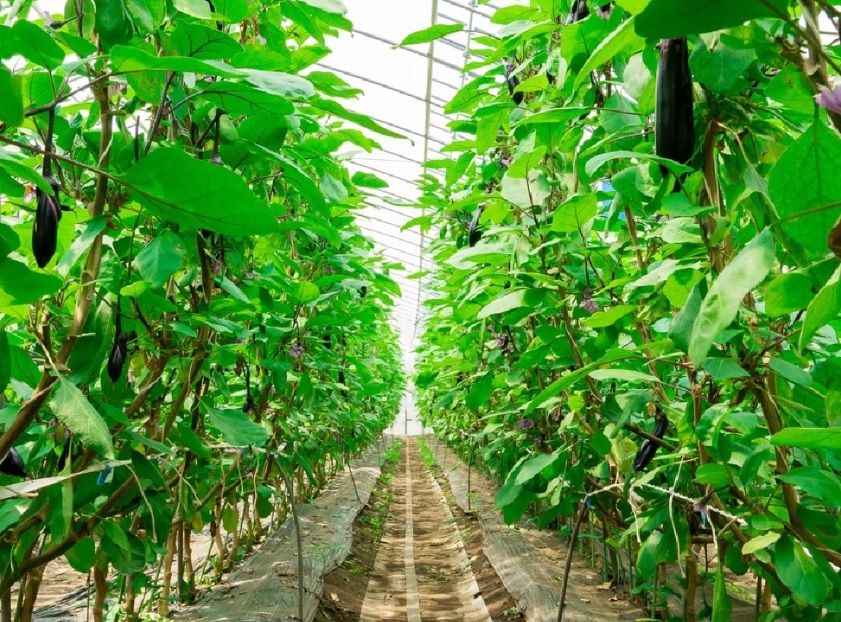 ハウス栽培でナスの生育に合わせた環境制御を行うことで、ほぼ1年を通して安定的に品質を保った長ナスを収穫できます。